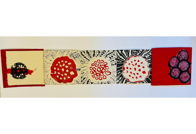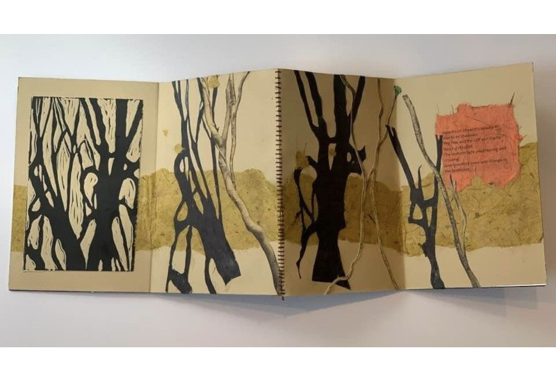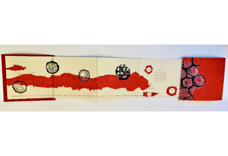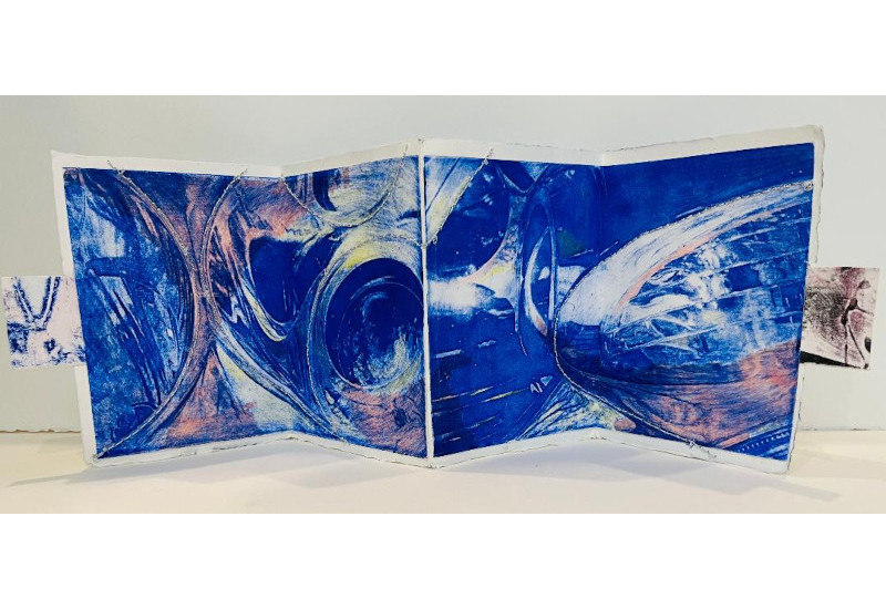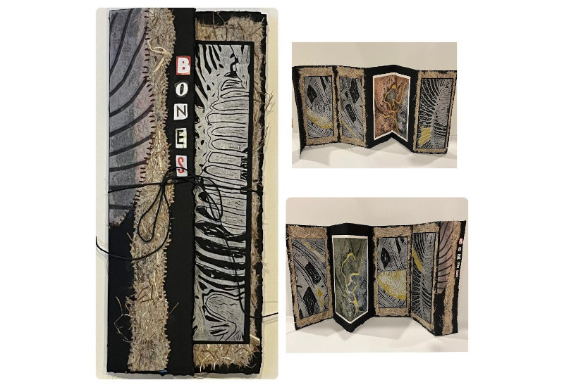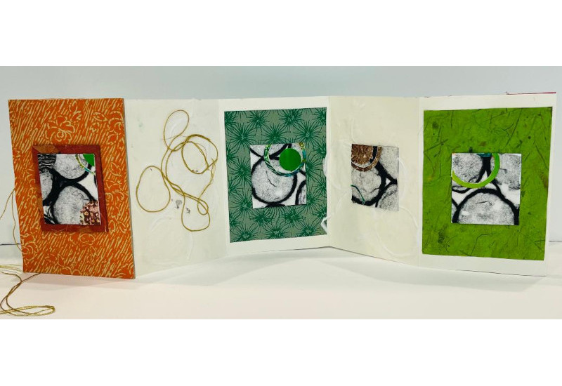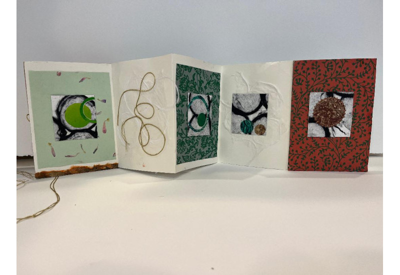 Hand sewn accordion book with embroidery thread<br>linocuts, solar prints. pencil, collage, and decorative papers