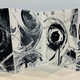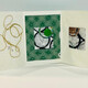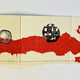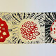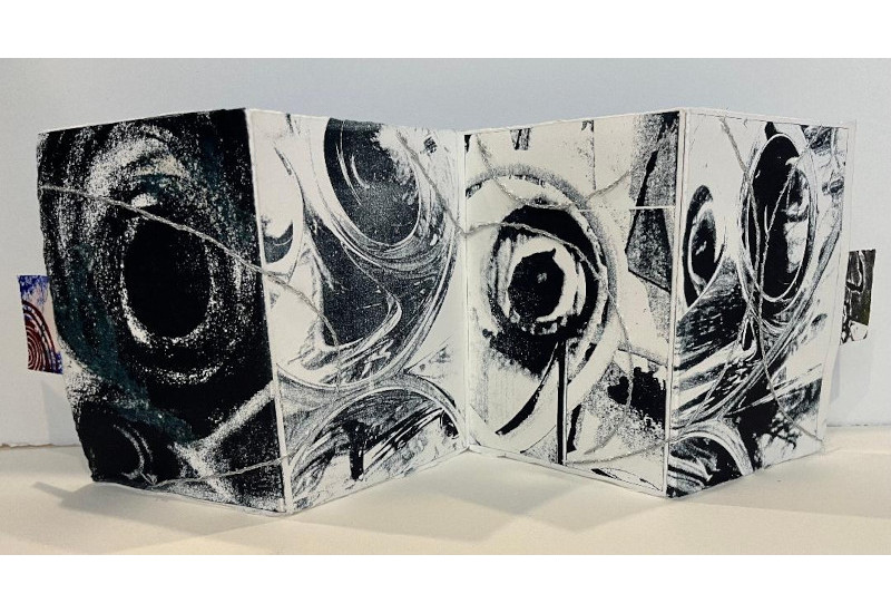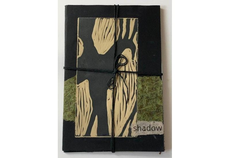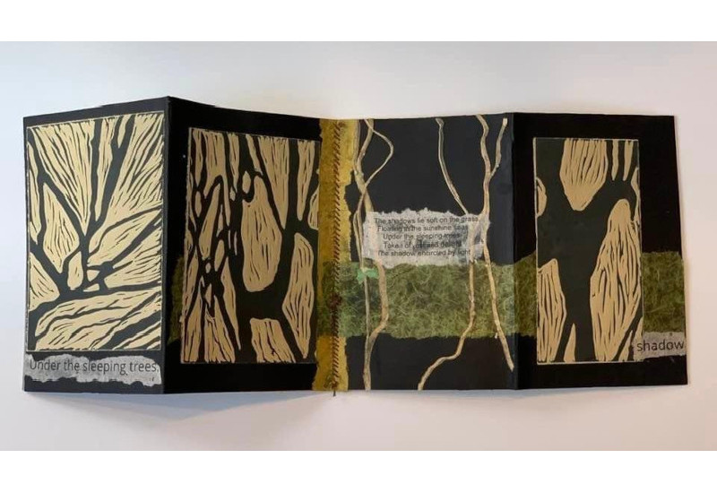Shadow, Hand sewn accordion book using embroidery thread<br>linocuts, collage, decorative paper, and poetry