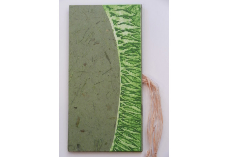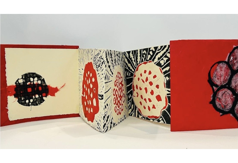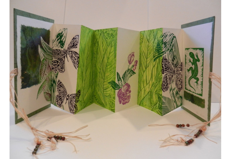 Tropical, Hand made accordion book<br>linocuts printed on rives BFK,collaged decorative papers raffia and beads